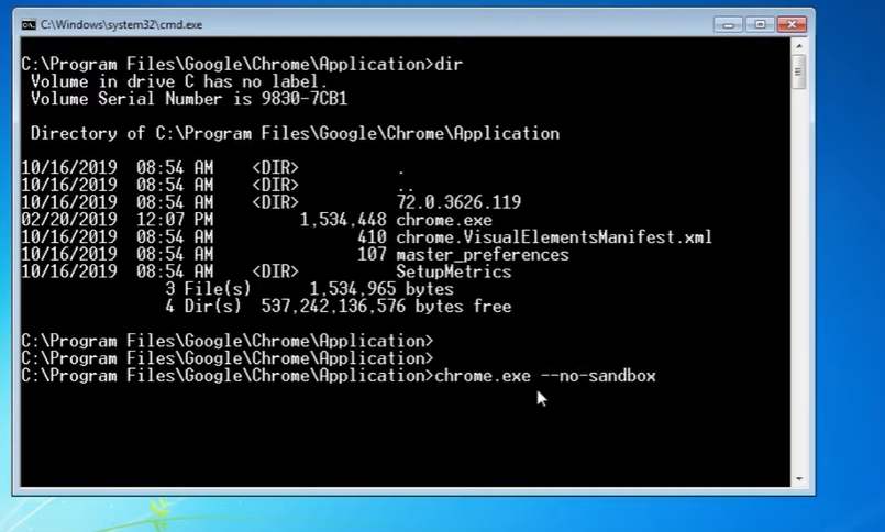 برای اینکه تست کنیم که روند به درستی انجام شده است گوگل کروم رو با حالت غیرفعال بودن SandBox در ویندوز ۷ اجرا کنید.