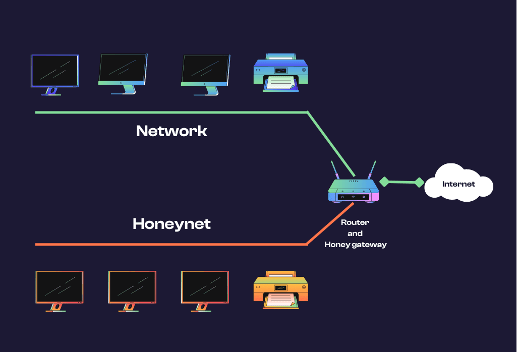 هانینت شبکهای از چندین هانیپات است که برای شبیهسازی یک شبکه واقعی، از جمله چندین سرور، پایگاه داده، روتر و سایر داراییهای دیجیتالی، طراحی شده است. هانینتها با ایجاد یک محیط گستردهتر و پیچیدهتر، مهاجمان را برای مدت طولانیتری درگیر نگه میدارند و امکان جمعآوری اطلاعات جامعتر و دقیقتر در مورد تاکتیکهای آنها، به ویژه برای نظارت گسترده بر فعالیت بدافزارها، فراهم میکنند. یک “هانیوال” (honeywall) ترافیک ورودی و خروجی هانینت را نظارت و کنترل میکند تا اطمینان حاصل شود که مهاجمان نمیتوانند به شبکه واقعی نفوذ کنند.